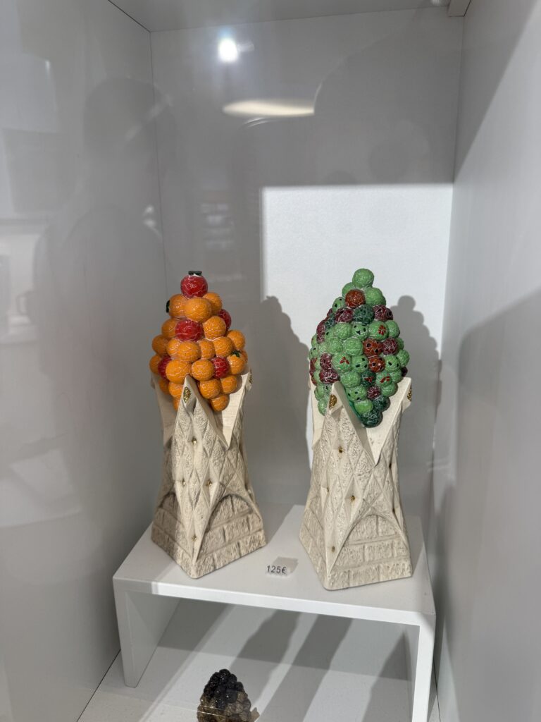 (照片中左)搭電梯上塔樓要額外購票,可是一出電梯沒多久就要往下走了,在塔樓上除了遠看巴塞隆納的風景就是近看塔頂的水果們