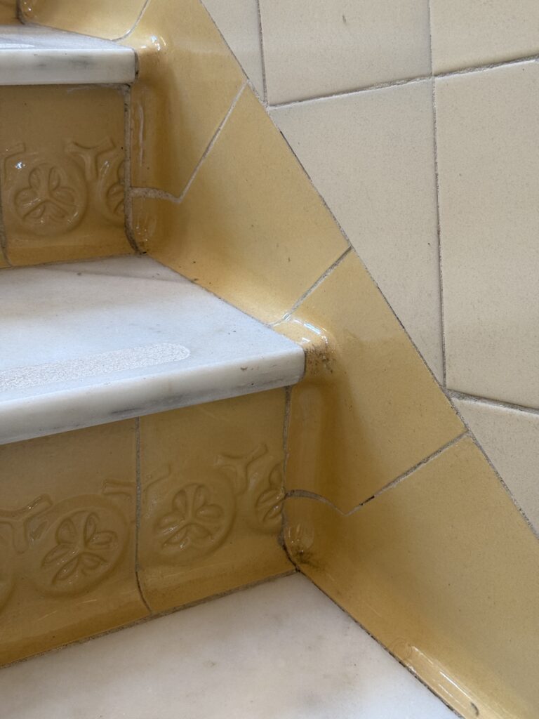 (照片下上)仔細看樓梯牆邊磁磚,他是平面磁磚延伸到樓梯的平面與立面,我沒有想到轉角磚可以做到這種精細程度
