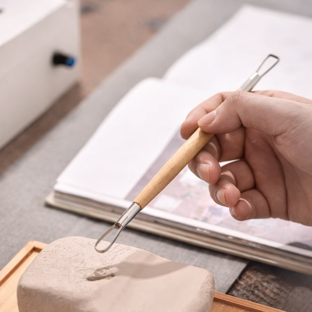 入門基礎款雙頭修坯刀,較常用於拉坯的修坯使用,刀刃較鈍可預防初學者把坯體修破。 圓端適用於坯體弧形部分的修飾,方端適用於坯體圈足的修整。
