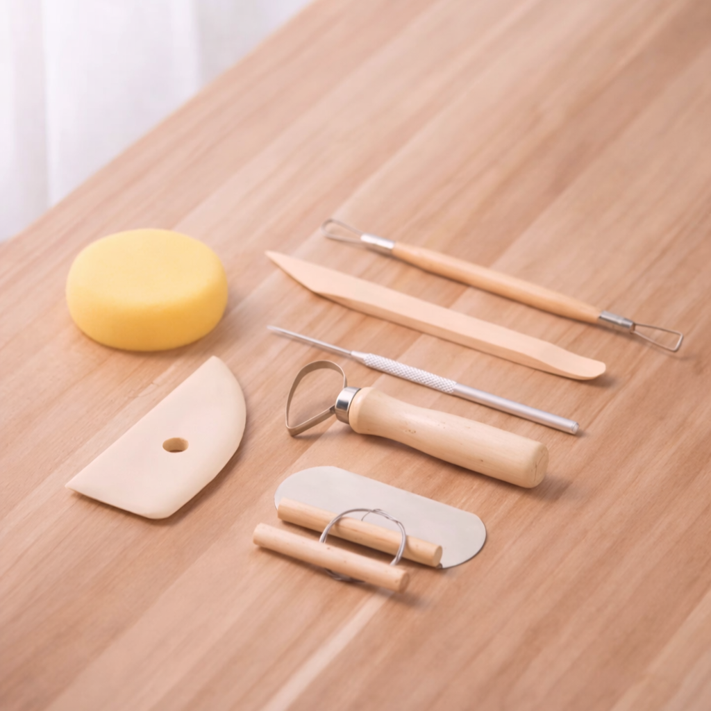 基礎陶藝手捏、拉坯、雕塑用工具組,是新手入門且經濟實惠的好選擇。內容含海綿、大小修坯刀、切土線、鐵腎片、針錐、木刀、三角片。