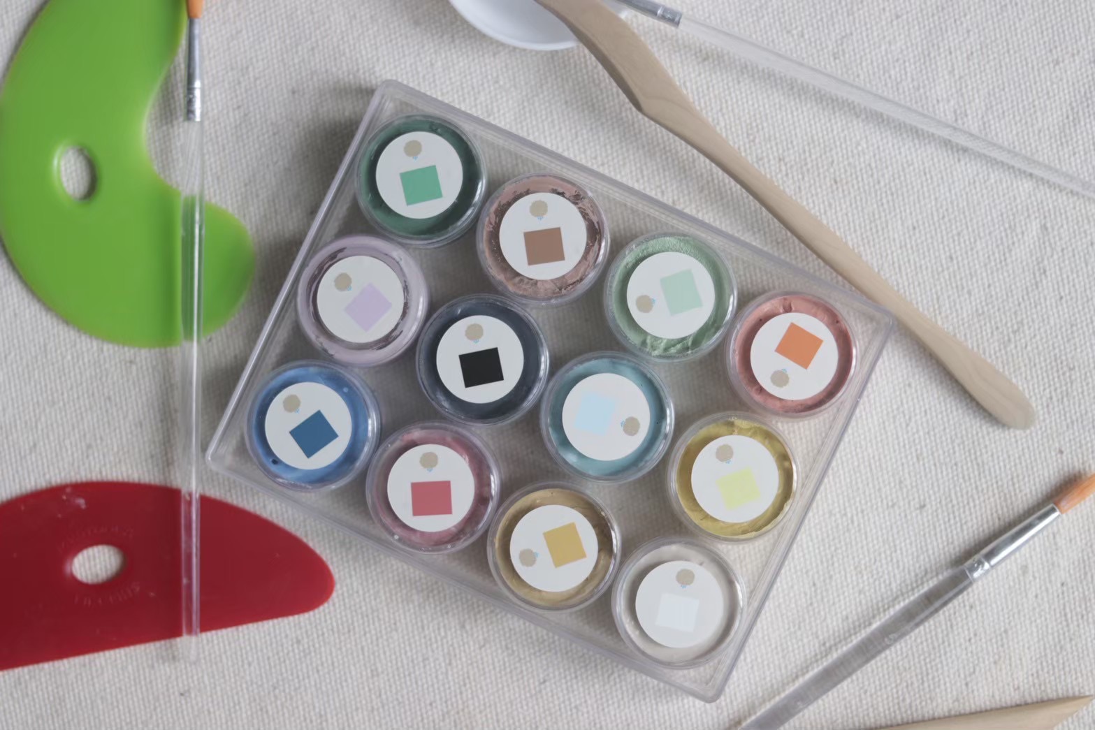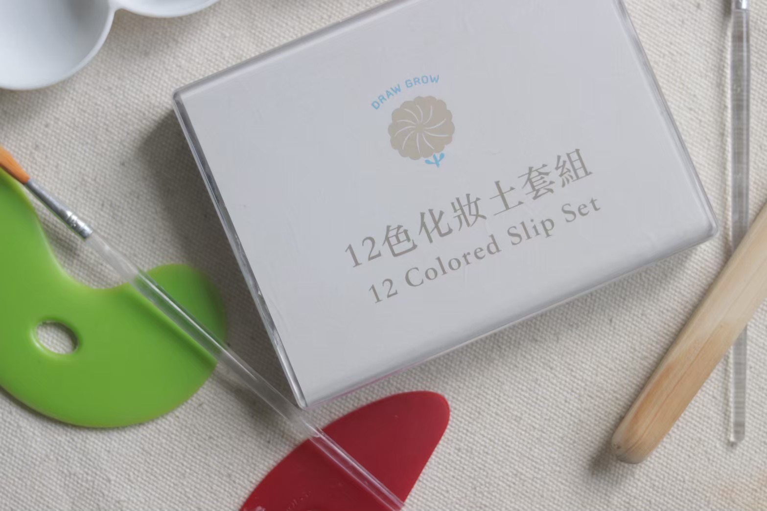 12色化妝土放在桌上旁邊散落用具12色化妝土